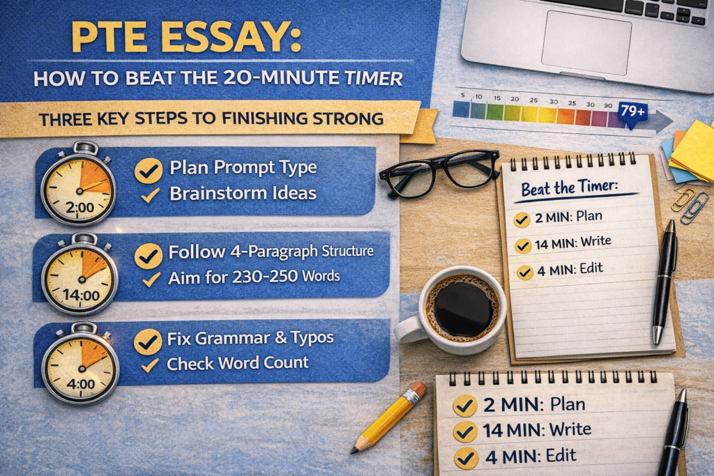 The PTE Academic writing section is often the source of more cold sweats than any other part of the test. You see the prompt, the timer starts ticking down from 20:00, and suddenly your brain decides it’s a great time to forget every English word you’ve ever learned.