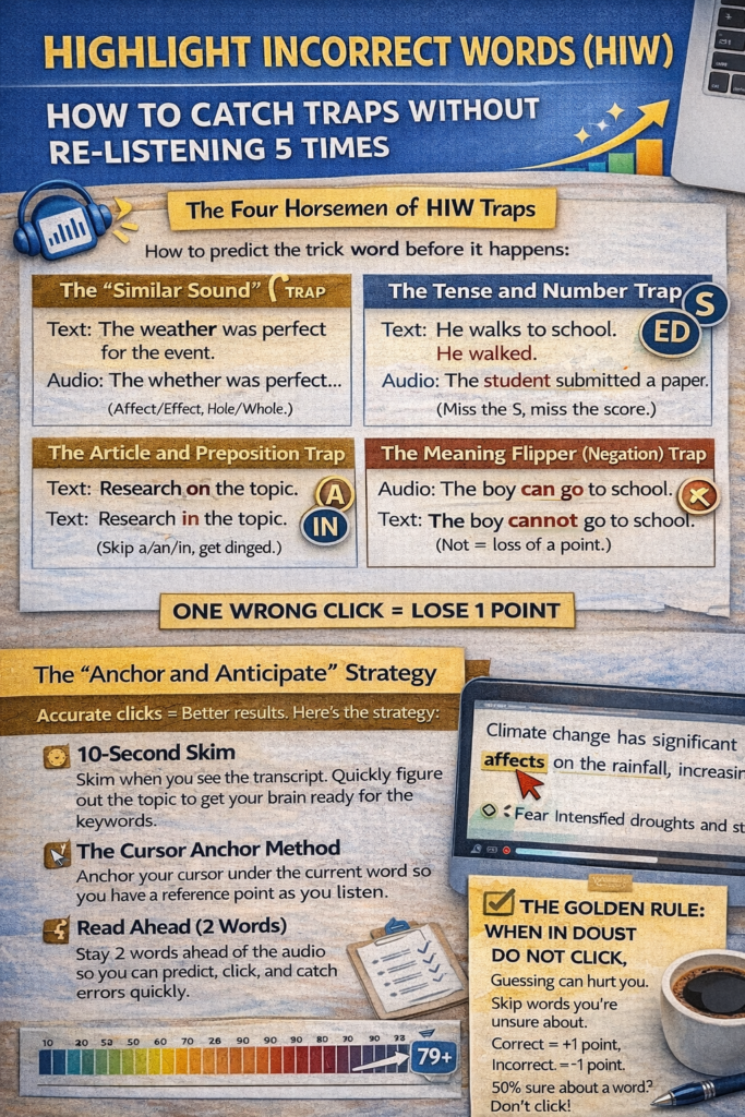 At first glance, this task looks like a gift. You see a transcript, you listen to a recording, and you just click the words that don’t match. Simple, right? Well, that’s exactly what the PTE wants you to think. HIW is actually a high-stakes game of focus that impacts both your Listening and Reading scores.