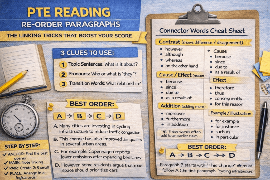 Re-order Paragraphs is one of those PTE Reading tasks that can feel annoying because the options often look almost right. You might understand every sentence, but still get stuck trying to decide between two “possible” orders.